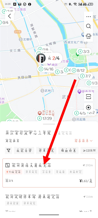 3、进入充电桩地图,选择目标充电站,进入充电站详情页。