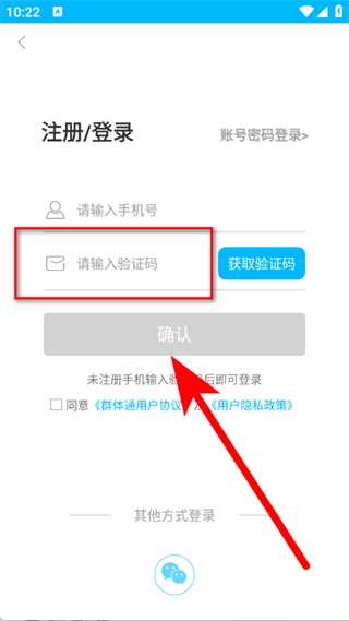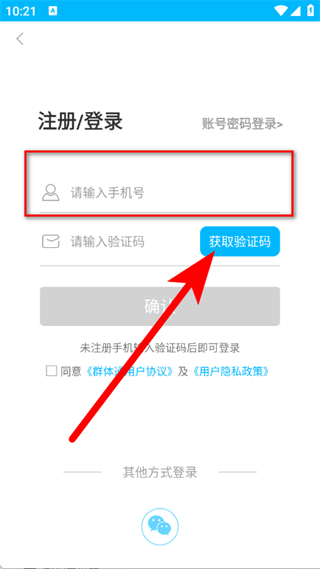 3、在注册登录页面,输入手机号,点击获取验证码。
