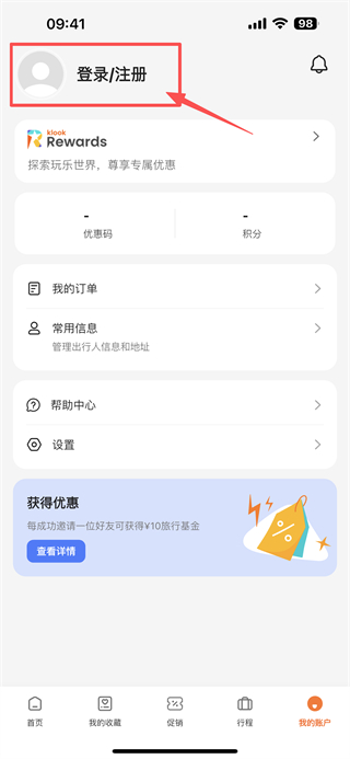 2、在个人中心,点击登录/注册选项,进入登录方式选择页面。