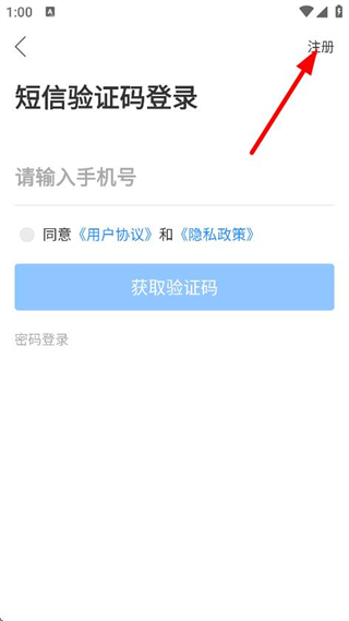 3、在登录页面,点击右上角注册,进入手机验证页面。