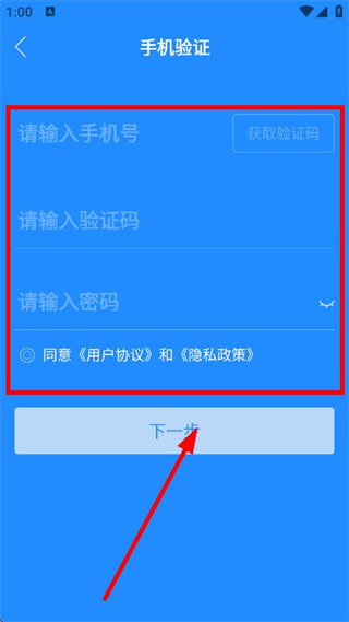 4、输入手机号、验证码、密码后,点击下一步,完成账号注册操作。