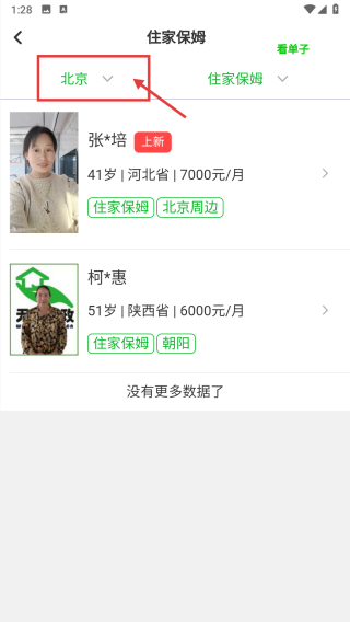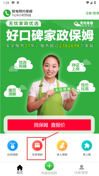 1、打开家政服务类APP首页,点击住家保姆选项,进入住家保姆页面。