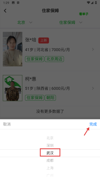 2、在住家保姆页面,点击城市选择区域,将城市切换为武汉,点击完成。