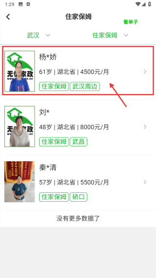 3、在武汉住家保姆列表页面,点击杨*娇保姆条目,进入该保姆的详细信息页面。