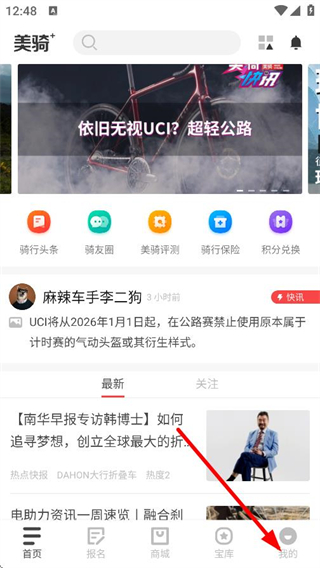 1、在美骑的首页,点击底部我的,进入个人页面。