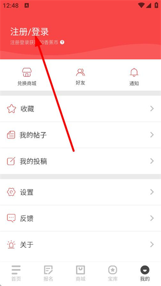 2、在个人页面,点击注册/登录,进入登录注册选择页面。