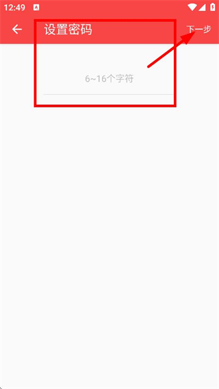 4、输入手机号,点击获取验证码并输入后,点击下一步,进入密码设置页面。