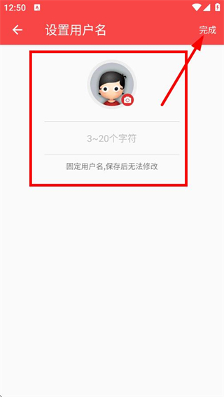 6、在用户名设置页面,设置3~20个字符的用户名后,点击完成,完成账号注册操作。