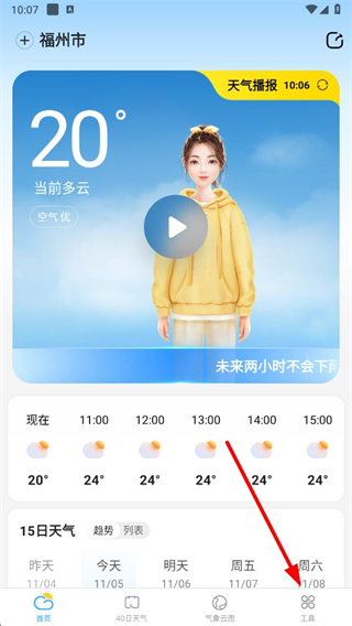 1、打开开心天气APP,点击底部工具进入工具页面。