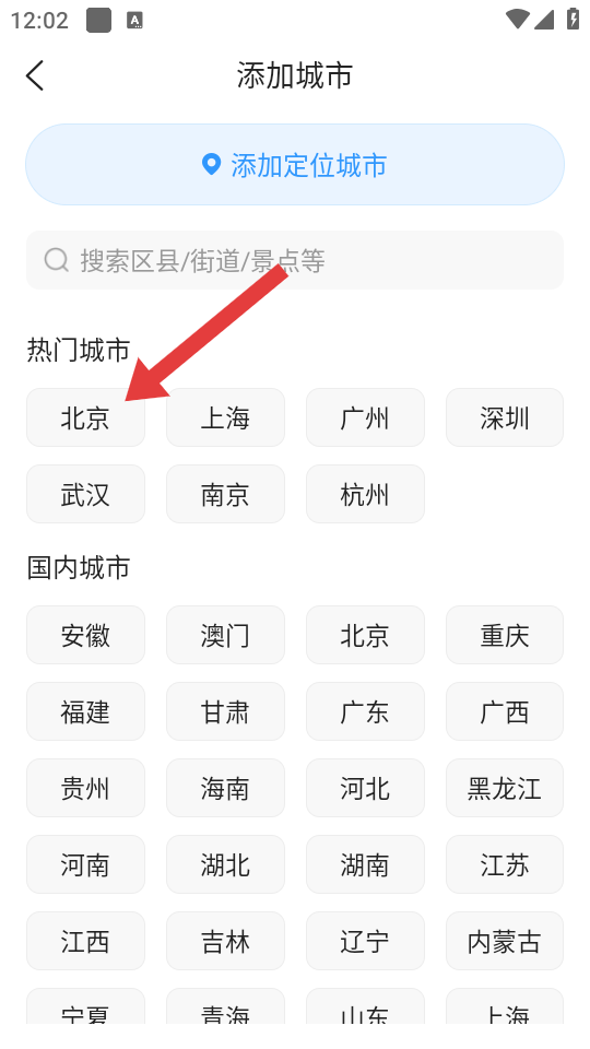 3、在添加城市界面,可通过搜索输入城市,或直接点击热门城市中的目标城市。