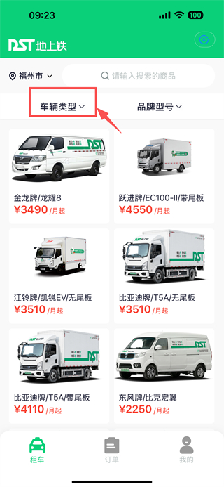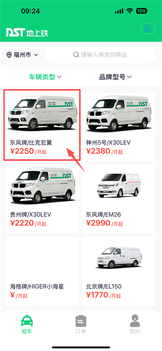 4、确认选择后,即可查看小面类型的车辆列表,如东风牌/比克宏翼等车型的租赁信息。