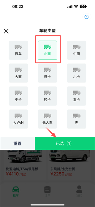 3、在车辆类型选择页面,点击小面类型,点击已选(1)确认选择。