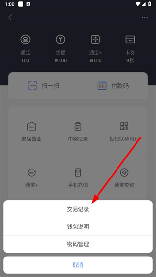 4、在弹出的选项中,点击交易记录选项即可查询交易记录。