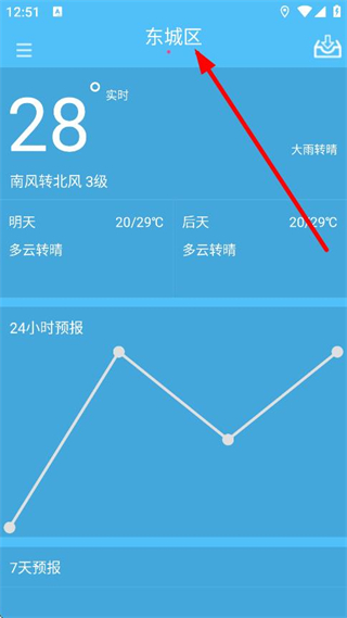 1、在天气页面,点击顶部东城区,进入城市管理页面。