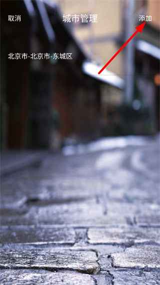 2、在城市管理页面,点击添加,进入城市选择页面。