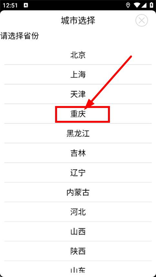 3、在城市选择页面,点击重庆,选择该城市。