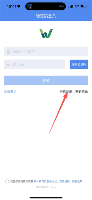 1、在验证码登录页面,点击司机注册,进入注册页面。