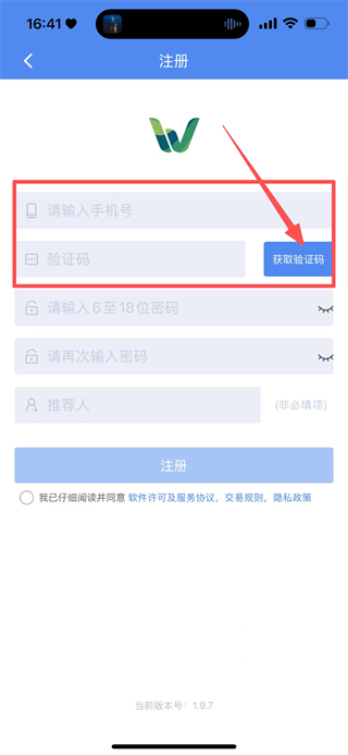 2、在注册页面,输入手机号后,点击获取验证码并输入。