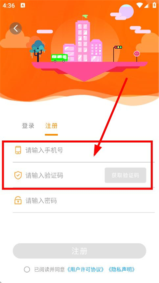 4、输入密码,同意相关协议后,点击注册,完成账号注册操作。