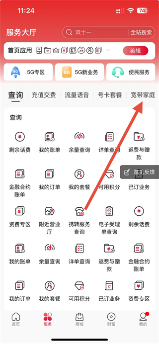 2、在服务大厅页面,点击宽带家庭选项,进入宽带家庭服务页面。