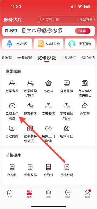 3、在宽带家庭服务页面,点击免费上门测速选项,进入预约网络检测单页面。