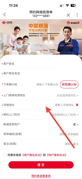 4、在预约网络检测单页面填写个人信息,勾选同意协议后点击提交,即可完成免费上门测速服务预约。