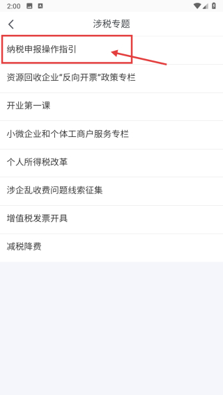 3、在专题列表页,点击纳税申报操作指引选项,进入操作指引详情页。