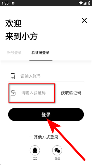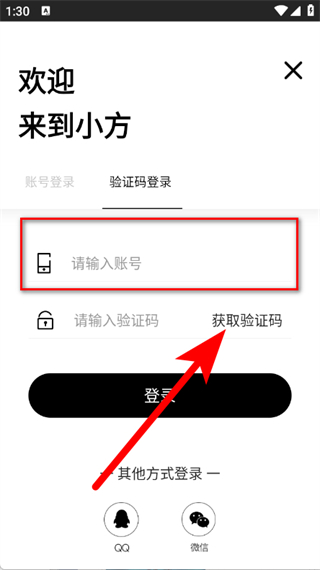 3、在登录页面,选择验证码登录,输入手机号,点击获取验证码。