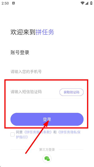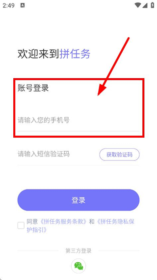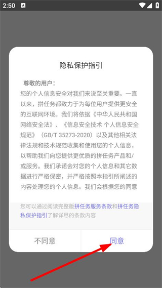 1、在隐私保护指引弹窗中,点击同意,进入拼任务登录页面。