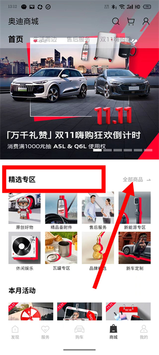 2、在奥迪商城页面,点击精选专区的全部商品。