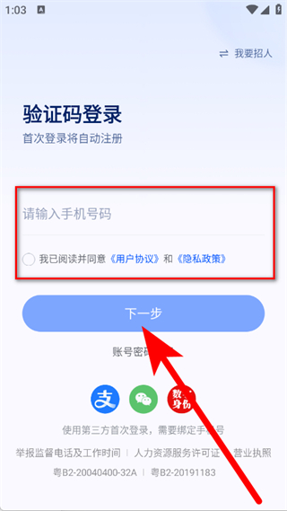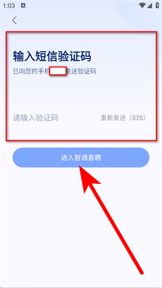4、输入短信验证码,点击进入智通直聘,完成登录操作。