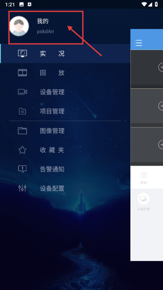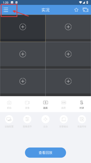 1、打开监控类APP,点击左上角菜单按钮,展开功能列表。
