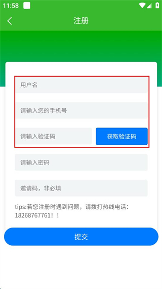 3、在注册界面,依次填写用户名、手机号,获取并输入验证码。