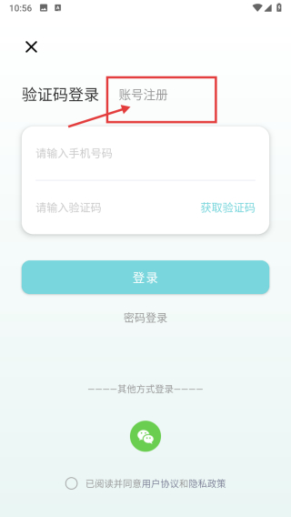 3、在登录界面,点击账号注册选项,切换至账号注册页面。