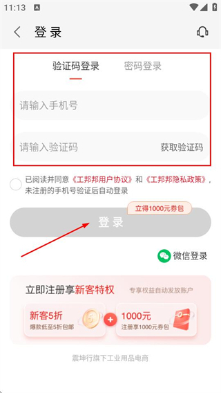 3、在登录界面选择验证码登录,输入信息,勾选协议后点击登录即可。
