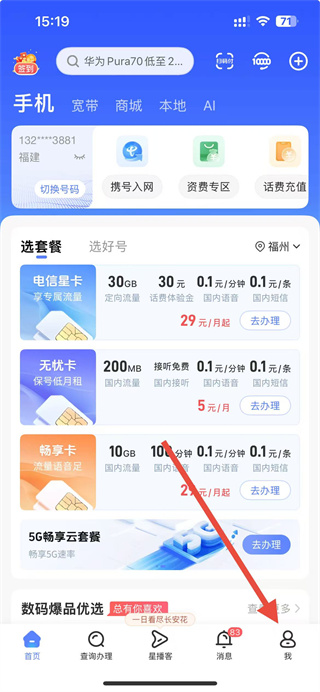 1、在中国电信App界面,点击右下角我选项,进入个人页面。