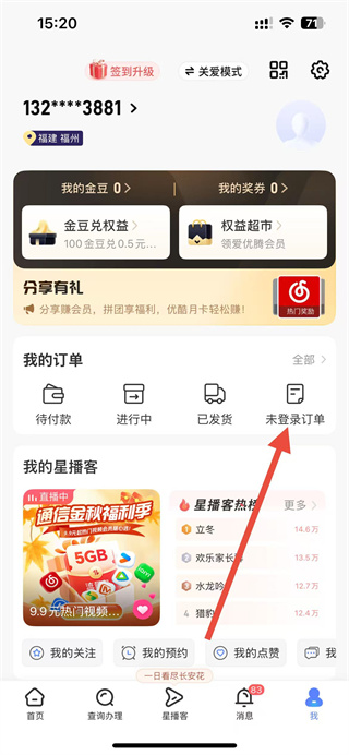 2、在个人页面中,找到订单查询相关入口,进入订单查询界面。