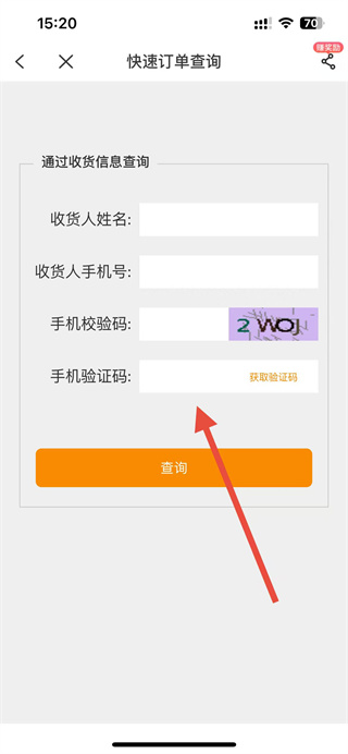4、在快速订单查询界面,输入收货人姓名、手机号、手机校验码和验证码,点击查询按钮,完成其他订单查询操作。