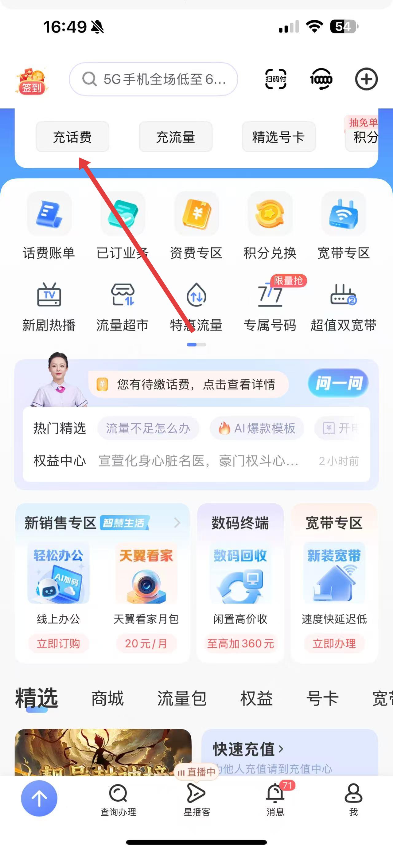 1、打开中国电信对应的手机营业厅APP,在首页找到并点击充话费按钮。