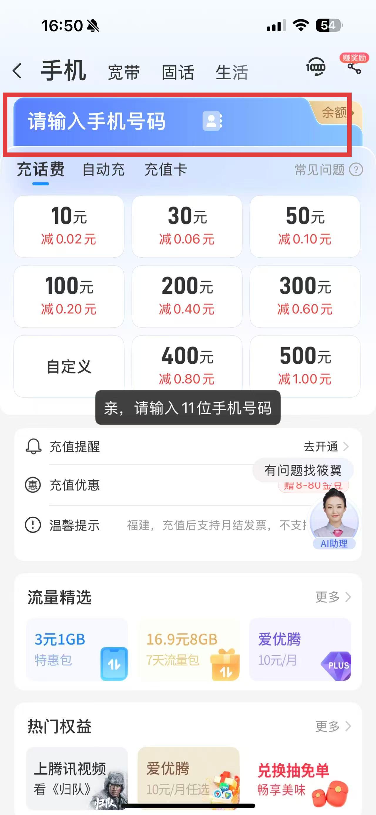 2、进入充话费界面后,在请输入手机号码的输入框内,准确填入需要充值的手机号码。