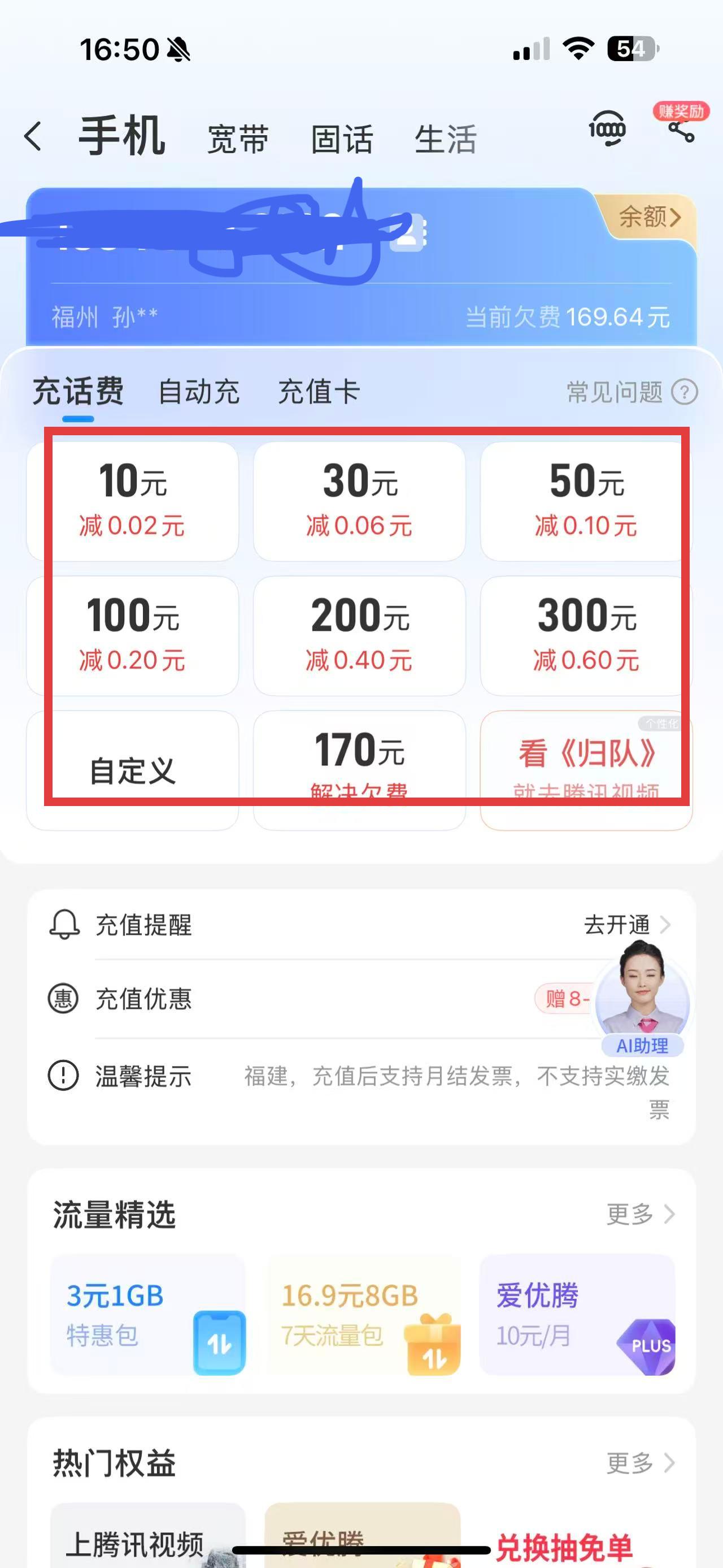 3、根据自身需求,选择对应的充值金额选项,如10元、30元等,然后按页面提示完成支付操作,即可完成话费充值。