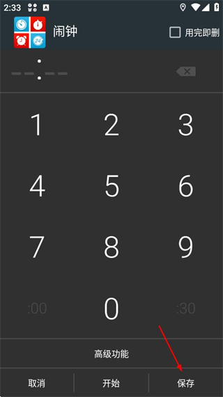 3、在数字输入界面设置好时间后点击保存,完成闹钟设置