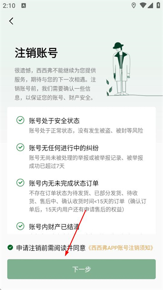 5、在注销账号界面确认满足条件后勾选协议并点击下一步。