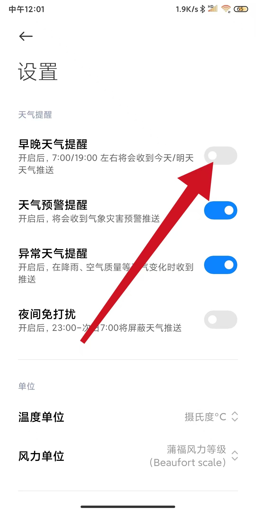 3、在设置页面中找到早晚天气提醒选项,点击其右侧开关按钮。