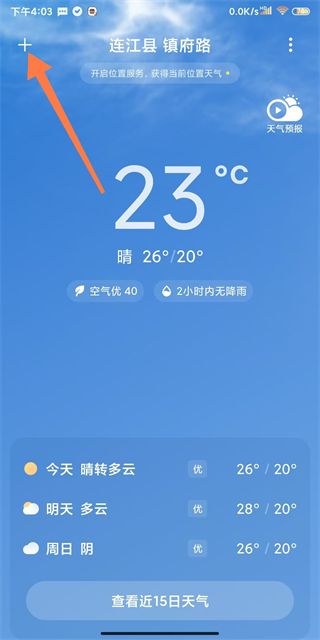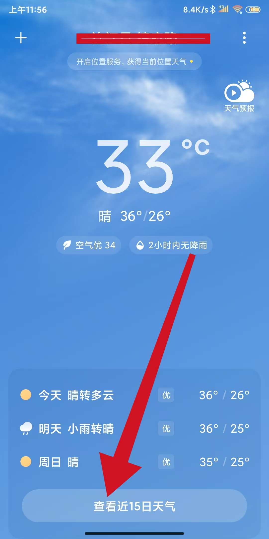 3、回到天气app主界面,找到并点击查看近15日天气按钮。