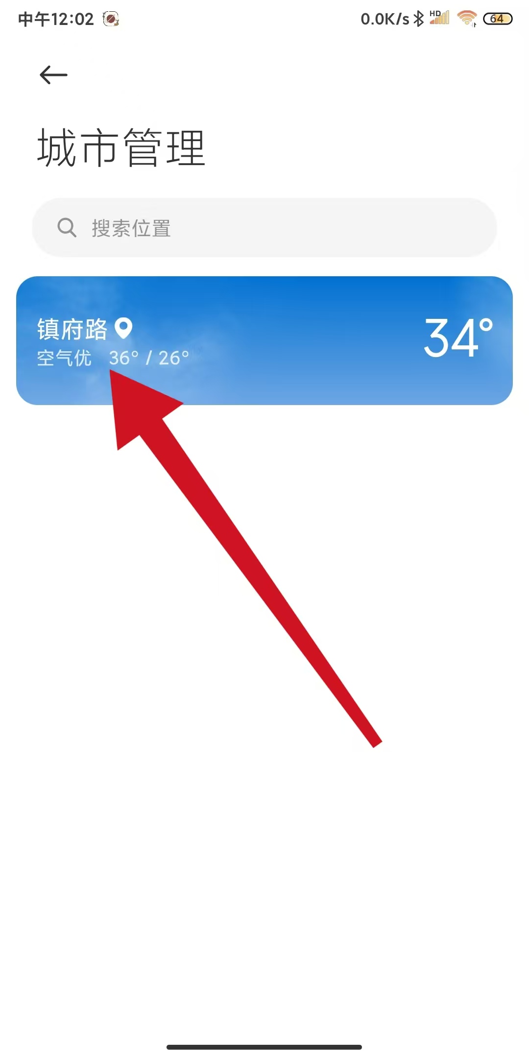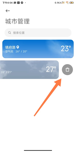 2、在城市管理页面,找到要删除的其他城市,往左滑动。