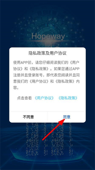 1、在用户协议弹窗中,点击同意,进入登录页面。