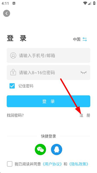 2、随后可以在登录页面,点击注册,进入注册页面。