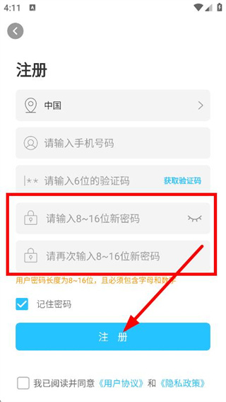4、随后设置密码并再次确认后点击注册,完成注册操作。
