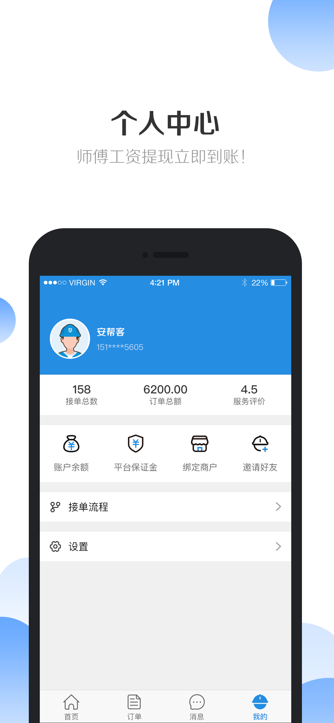 个人中心,师傅工资提现立即到账